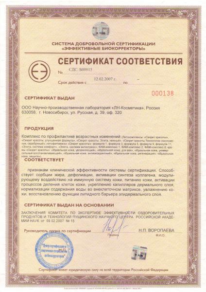 ООО Научно-производственная лаборатория «ЛН-Косметика» - обладатель Сертификата соответствия продукции Комплекс по профилактике возрастных изменений (Литокомплексы: «Секрет Красоты», «Секрет Красоты, улучшенная форма», «Секрет Красоты, Элита, нежный», «Секрет Красоты, Технологии омоложения, серебряный»; Литофитомаски «Секрет Красоты»: формула 1, формула 3, формула 5, формула 9, формула 11, «Элита, система комфорт», «Элита, система антистресс»; ФАМ-комплекс 1, ФАМ-комплекс 2, ФАМ-комплекс 8; кремы «Секрет Красоты»: «Идеальная кожа, увлажняющий», «Идеальная кожа, для век», «Идеальная кожа, универсальный восстанавливающий», «Идеальная кожа, антиоксидантный», «Идеальная кожа, регенерация», «Идеальная кожа, защита»).