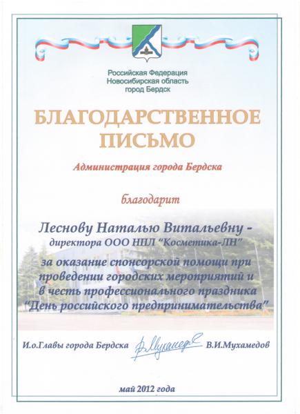 Леснова Наталья Витальевна – директор ООО НПЛ «ЛН-Косметика» – награждена благодарственным письмом от администрации города за оказание спонсорской помощи при проведении городских мероприятий и в честь профессионального праздника «День российского предпринимательства».