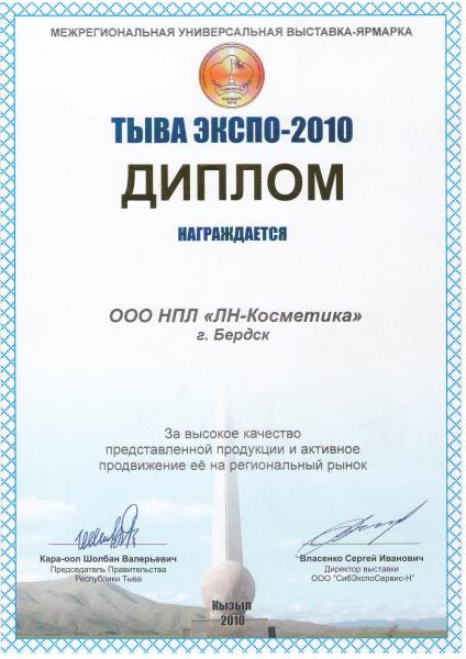 ООО НПЛ «ЛН-Косметика» награждена Дипломом Межрегиональной универсальной выставки-ярмарки «ТЫВА ЭКСПО» 2010 года за высокое качество представленной продукции и активное продвижение её на региональный рынок.