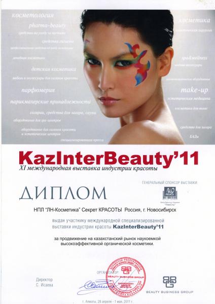 НПЛ «ЛН-Косметика» и Компания «Секрет Красоты» награждены Дипломом XI Международной выставки индустрии красоты KazlnterBeauty`11 за продвижение на рынок Казахстана наукоёмкой высокоэффективной органической косметики.