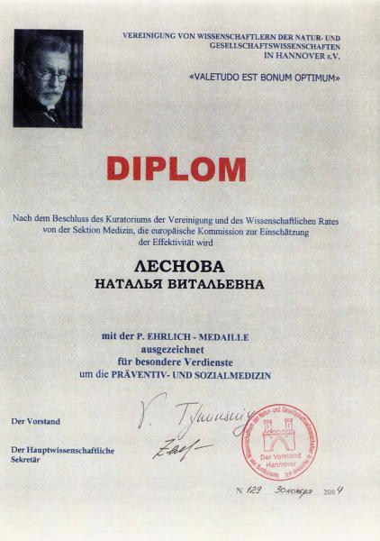 Леснова Наталья Витальевна награждена медалью им. П. Эрлиха за особые заслуги в области социальной и профилактической медицины. Решение попечительного совета союза ученых и научного совета секции медицины. Европейская Комиссия по оценке эффективности. №129 от 30 ноября 2004.
